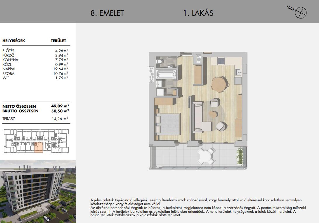 Napfényes, nyugati fekvésű, amerikai konyhás nappali + 1 hálószobás lakás 14,26 nm-es terasszal